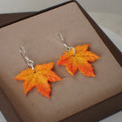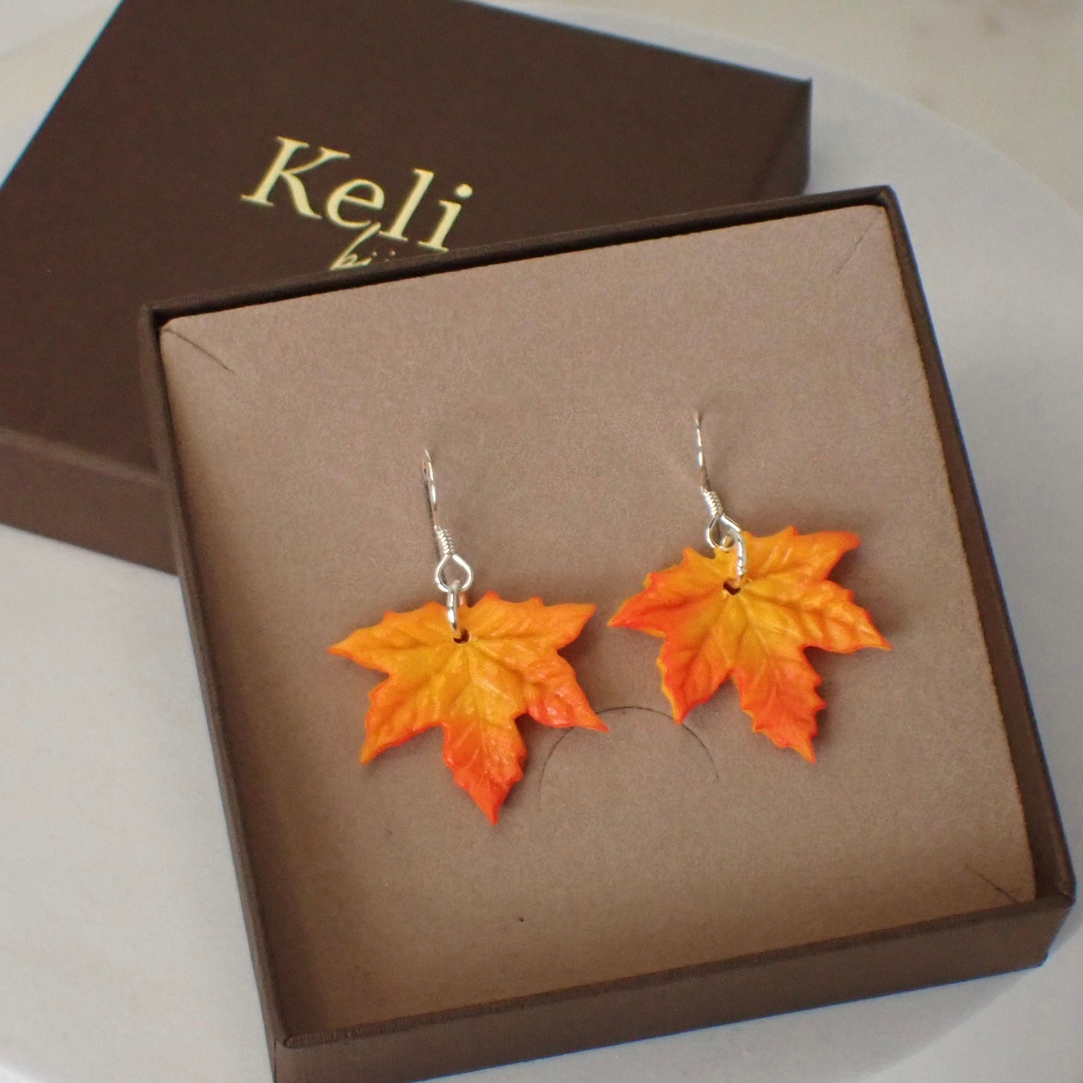 Handskulpterade lönnlöv i polymerlera som skiftar i olika färger. Krokar i äkta sterlingsilver. Fjäderlätta, hållbara och eleganta.