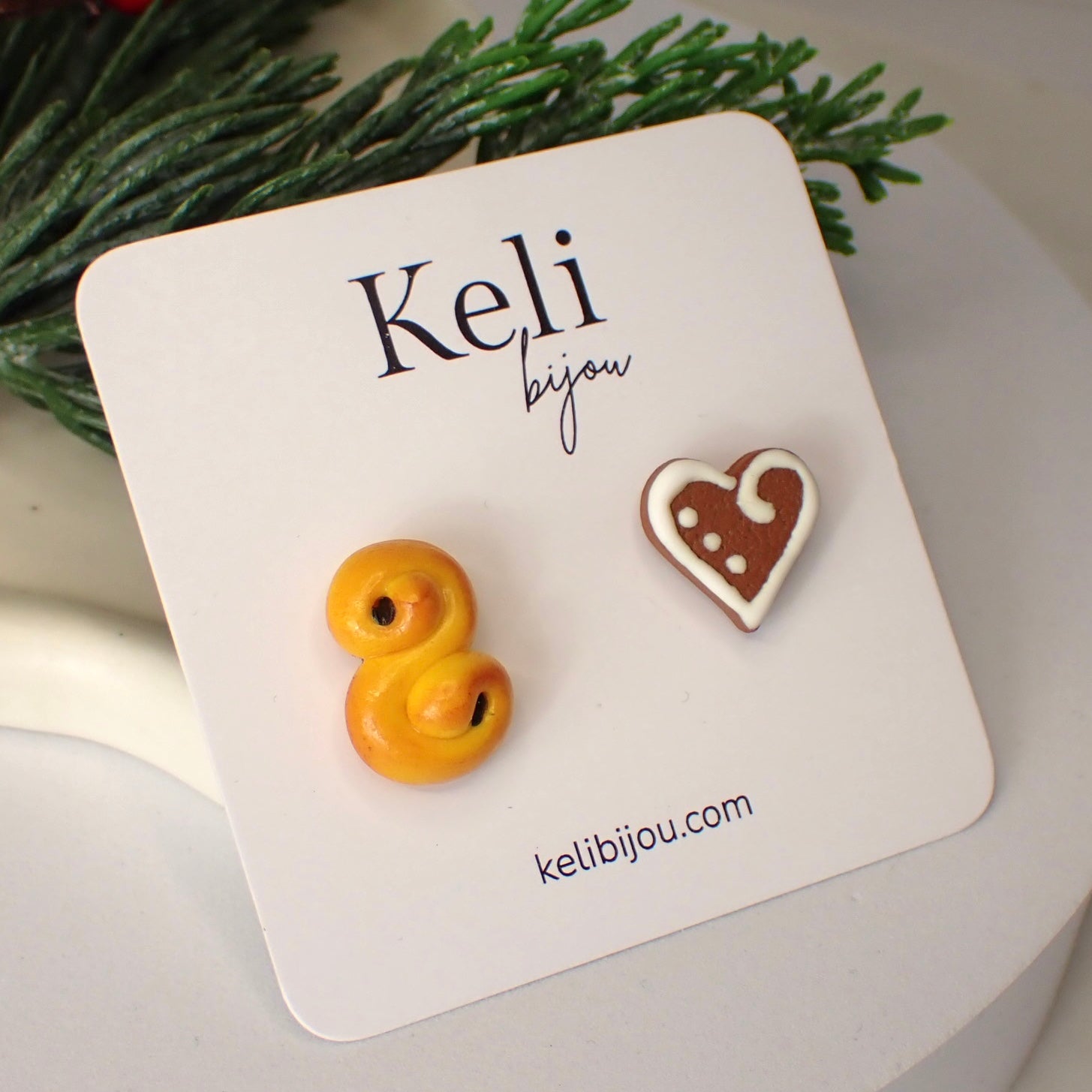 Handgjorda örhängen i polymerlera med en pepparkaka och en lussekatt. Tillverkade i nickelsäkra material med detaljer i silverpläterat stål och praktiskt bakstycke på baksidan av varje örhänge. Ett smycke som doftar barndom, julmys och svensk tradition – i elegant smyckesformat.