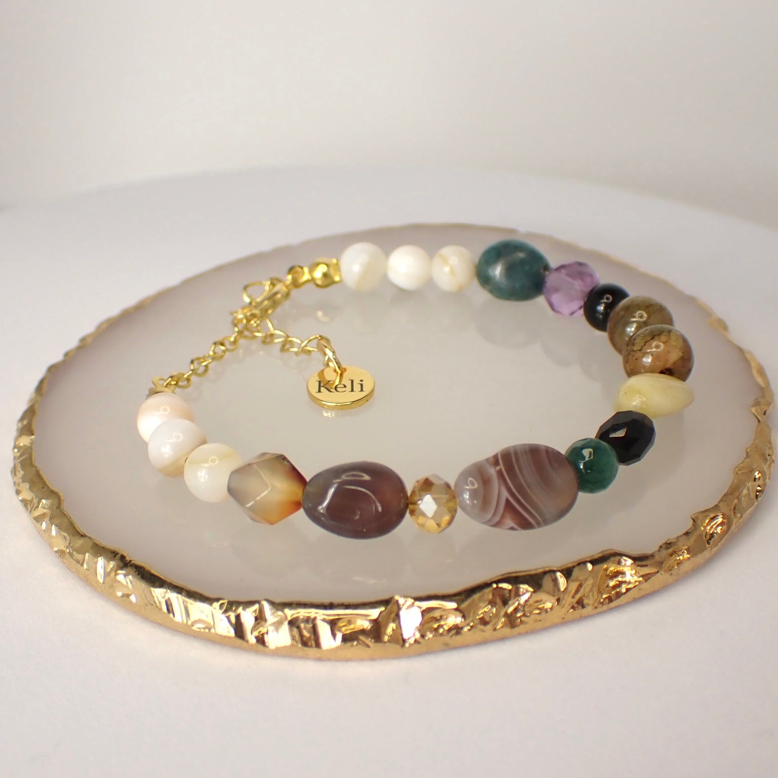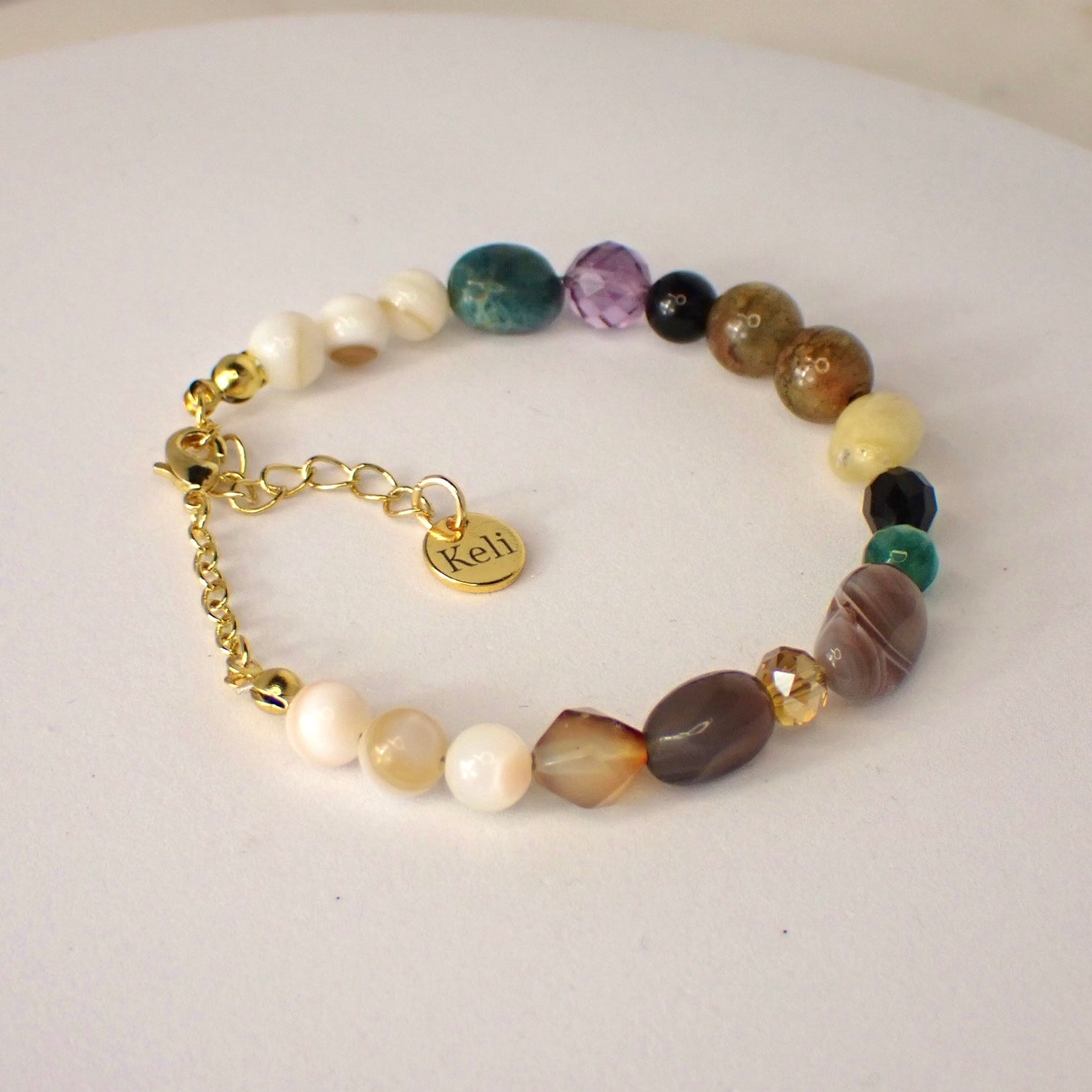 Handgjort armband med en vacker blandning av sten- och kristallpärlor i olika färg och storlek. 18 K guldpläterad kedja med en nickelsäker bas i rostfritt stål och praktiskt klolås. Ett exklusivt och elegant armband med vackra och välarbetade detaljer. Varje armband i serien är helt unikt och finns endast i begränsad upplaga. Ett verkligt personligt smycke och en vacker gåva. Armbandet mäter 18 cm med kedja.