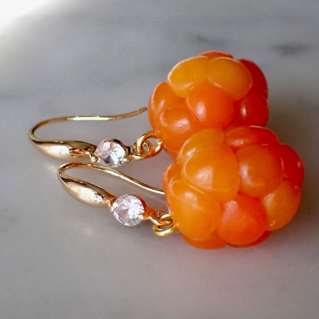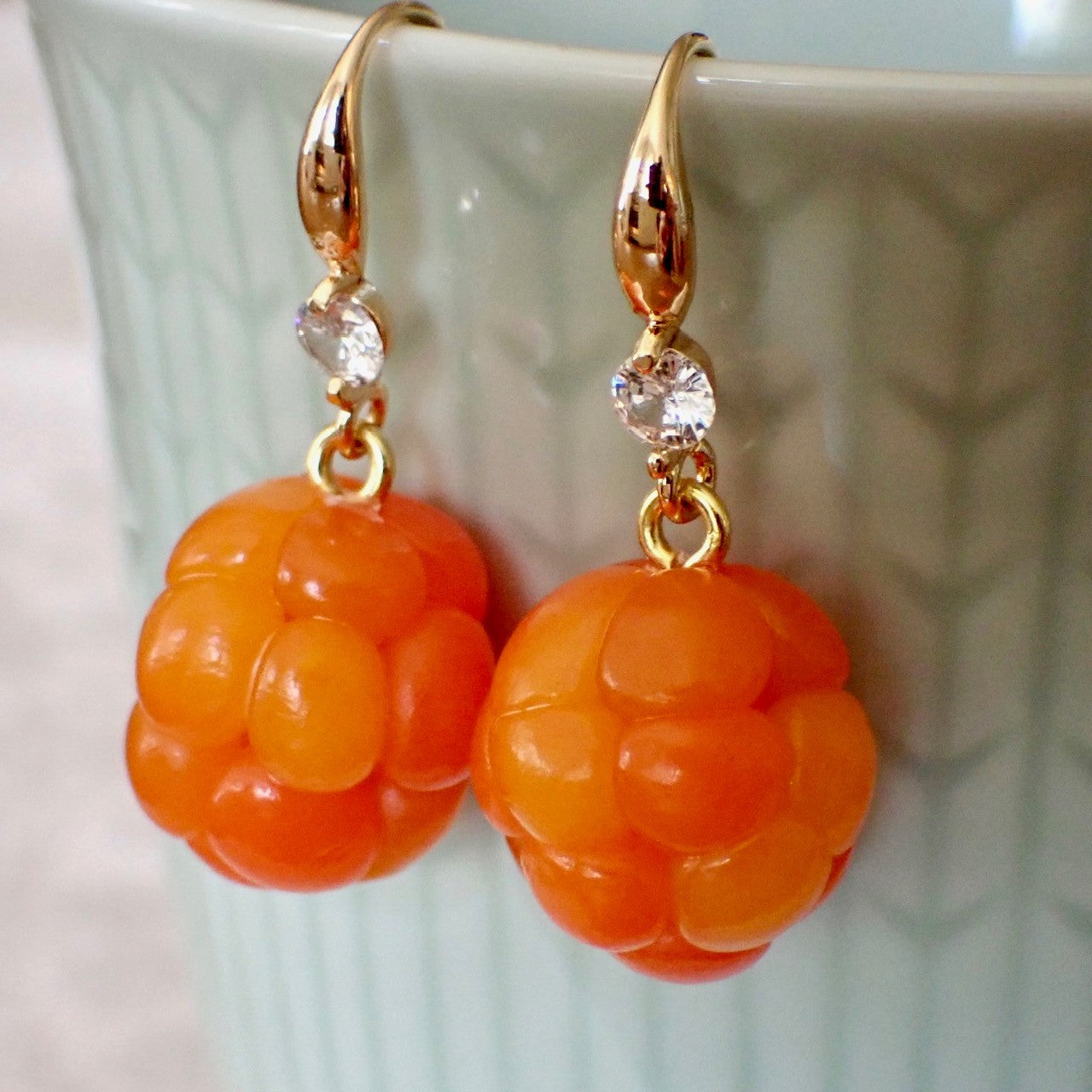 Dessa handgjorda örhängen i polymerlera hyllar Norrlands gyllene bär – hjortronet. Varje litet bär formas noggrant för hand, med varma orangea nyanser som fångar sensommarens ljus. De väger cirka 1,8 gram och mäter omkring 15 mm – lätta, verklighetstrogna och unika. Tillverkade i nickelsäkra material med krokar i 18 K guld med en vacker kristallpärla. Ett smycke som påminner om skog, myr och svenska sommarkvällar i gyllene ton.