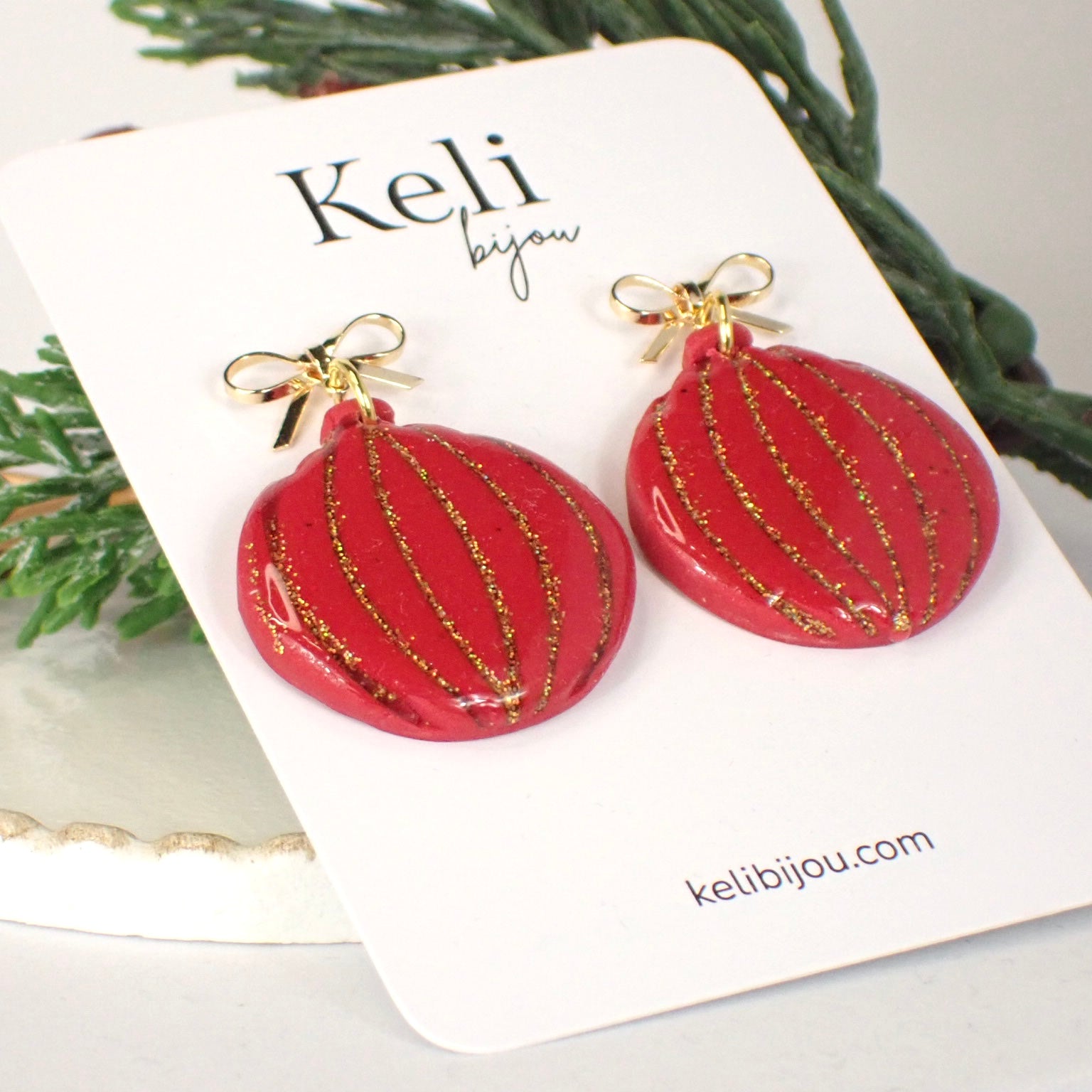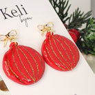 Glittrande julkulor i rött med rosettprydda krokar i guldpläterat och nickelsäkert stål. Örhängena mäter ca 25 mm i diameter men väger endast något gram - snygga men lätta i örat.