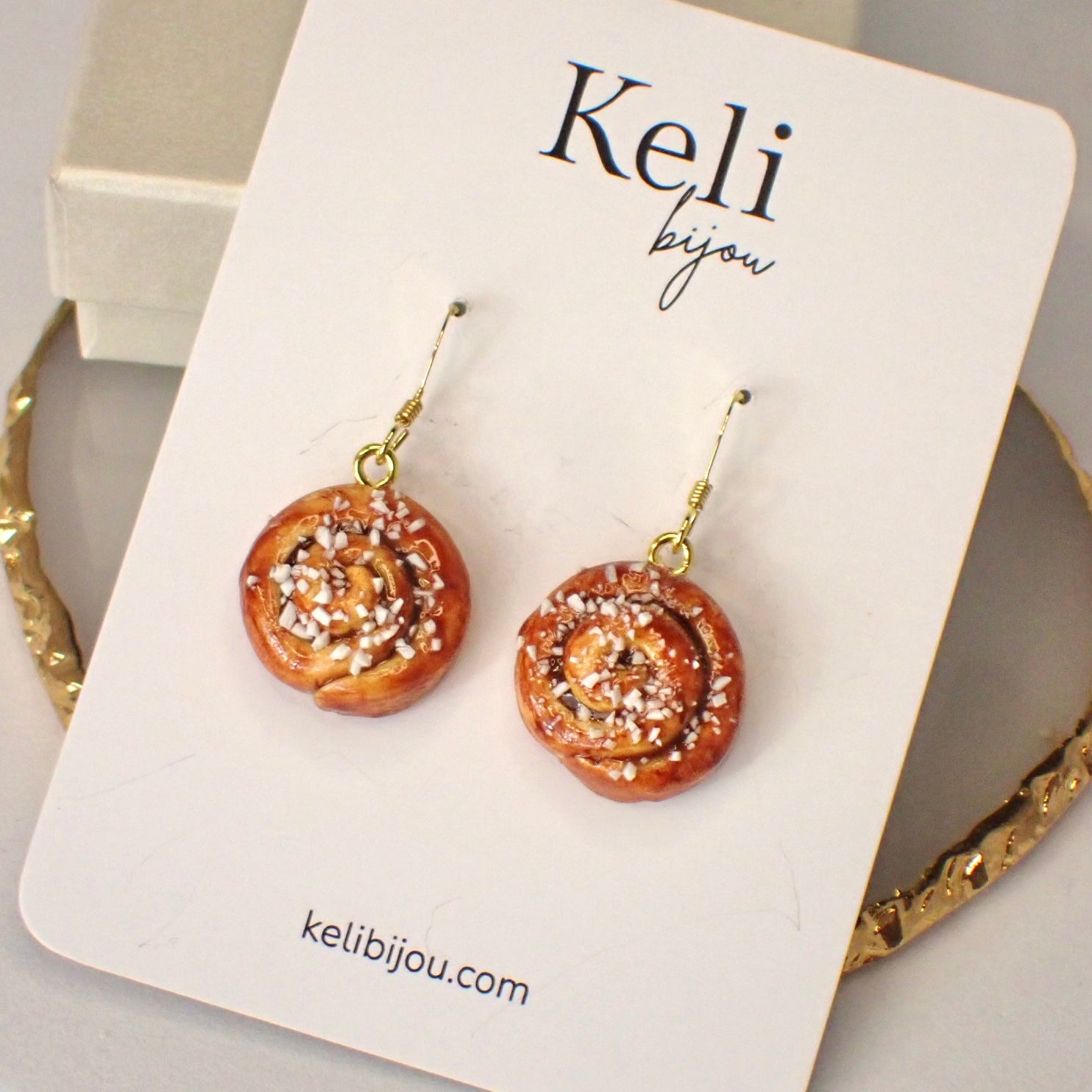 Ett par handgjorda örhängen i polymerlera som förvandlar den klassiska svenska kanelbullen till ett elegant blickfång. De små bullarna har glansig yta och realistiskt pärlsocker i lera – formade och målade för hand i ateljén. Varje par väger cirka 1,5 gram och mäter omkring 20 mm, vilket gör dem behagligt lätta att bära. Krokarna är tillverkade i äkta sterlingsilver med en tjock 18 karat guldplätering, vilket ger en varm och exklusiv ton som framhäver de gyllenbruna färgerna. Nickelsäkra, unika och skapade med kärlek till svensk design. Perfekta som present eller för dig som vill bära ett stycke fikakultur i smyckesform.