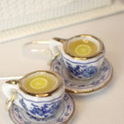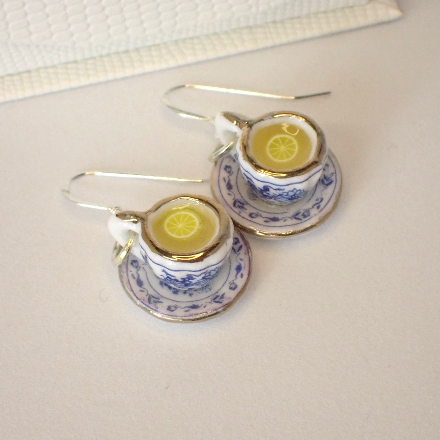 Dessa handgjorda örhängen föreställer små tekoppar på fat, dekorerade med ett vackert blått blommönster. Varje kopp och fat är unika och varje par örhängen blir one of a kind. Örhängena väger omkring 2 gram och mäter cirka 15 mm – lätta i örat men fyllda med detaljrikedom. Tillverkade i nickelsäkra material med krokar i äkta sterlingsilver 925. Ett smycke som förenar elegans, lekfullhet och kärlek till svensk fikakultur.