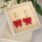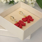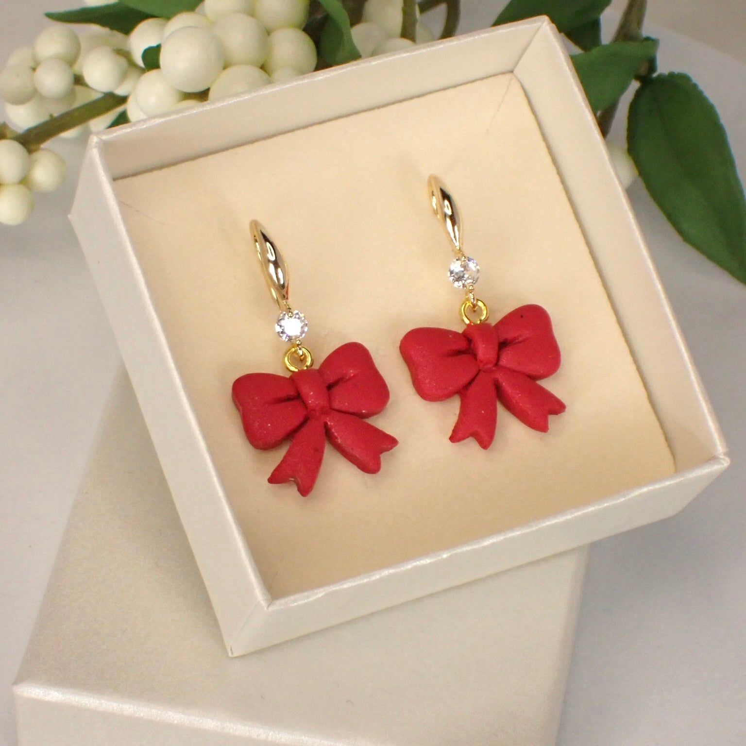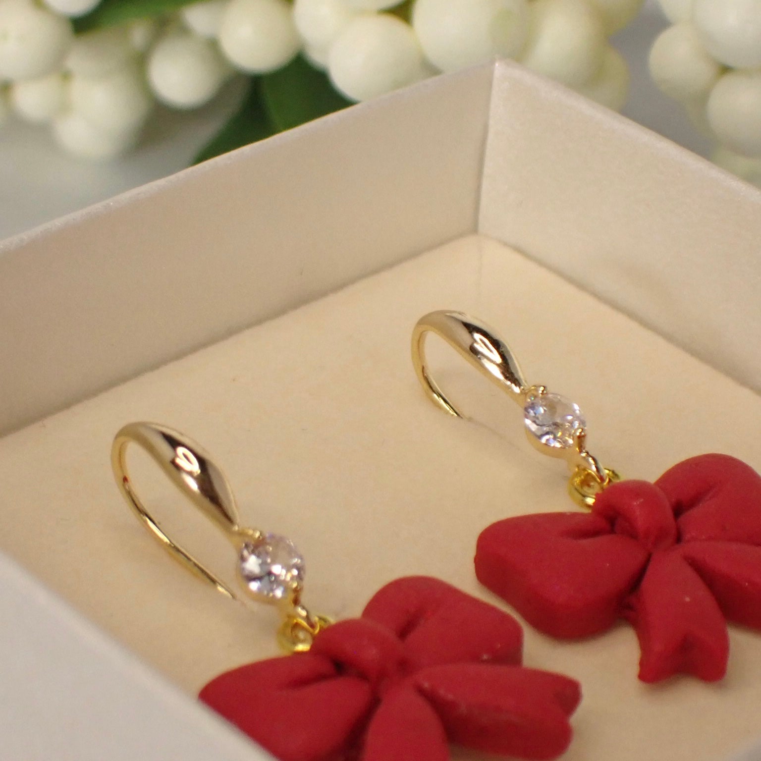 Söta röda rosetter i polymerlera på lyxiga guldpläterade krokar med kristaller av hög kvalitet. Handgjorda med precision – en fin balans mellan sött och elegant.