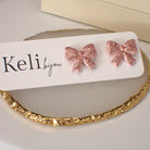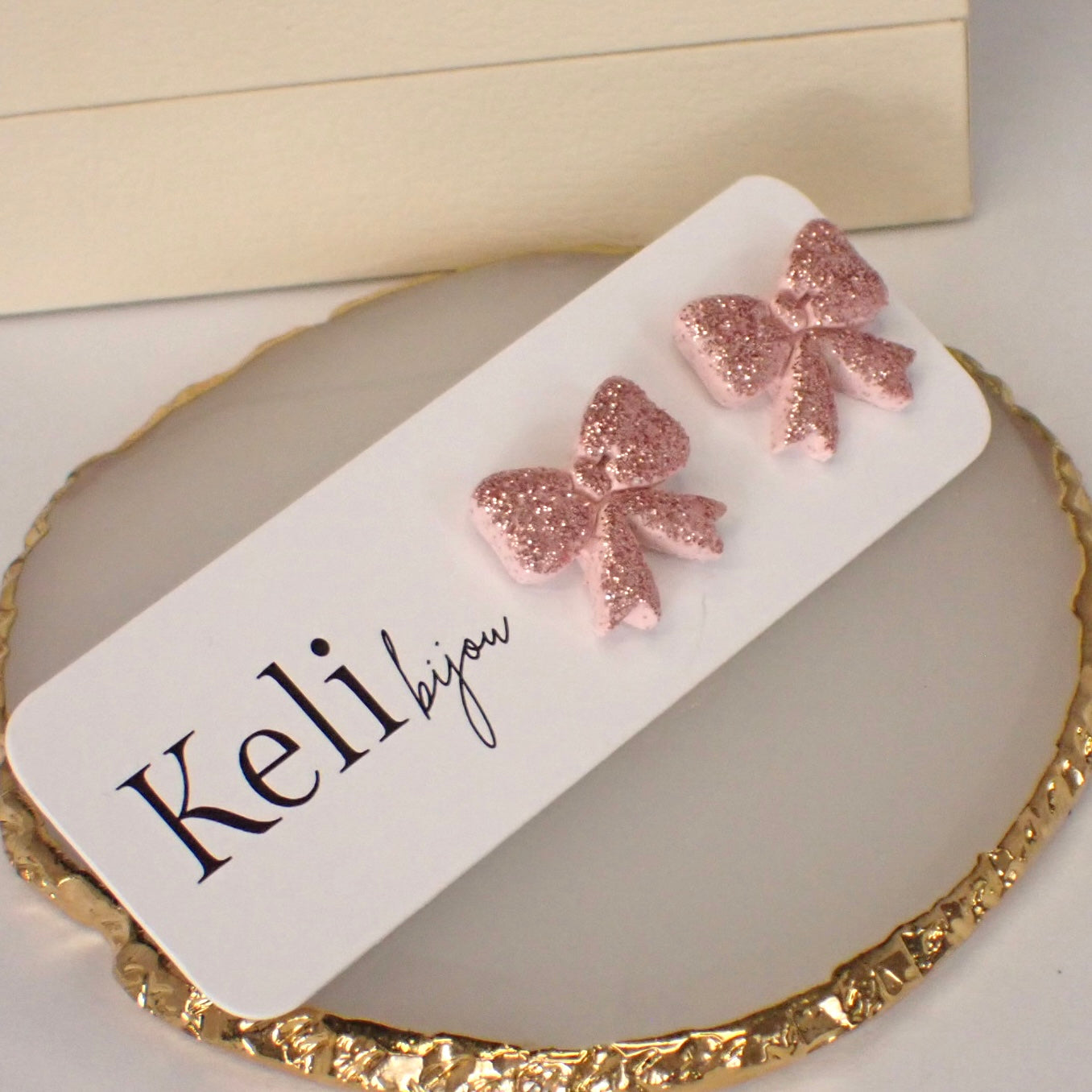 Små rosa glitterrosetter, handgjorda i polymerlera och monterade på nickelsäkra stiftörhängen. Diskreta men uttrycksfulla – passar till allt.