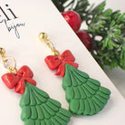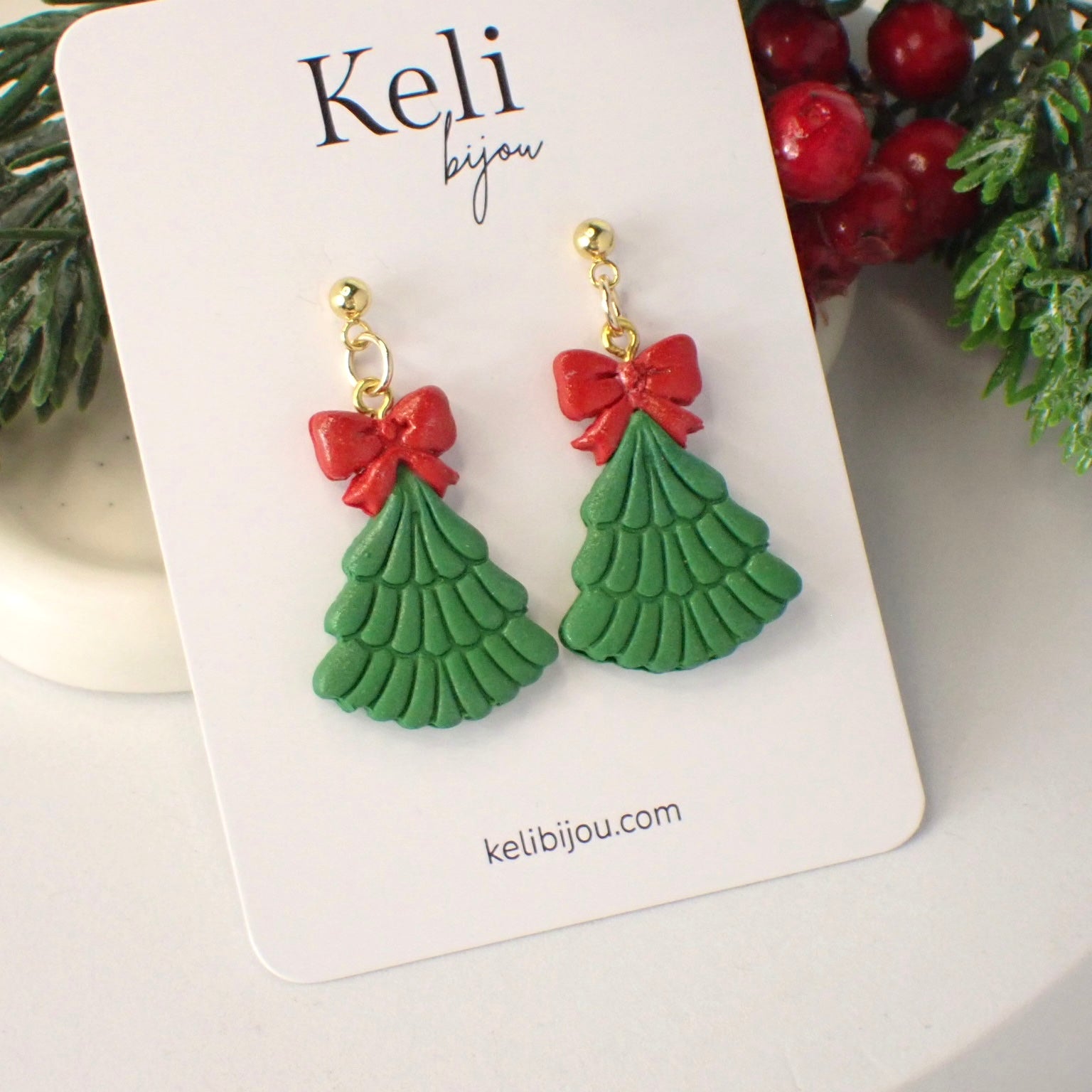 Handgjorda julgranar i polymerlera med röda rosetter och guldpläterade detaljer. Klassisk julkänsla möter elegant design – lätta och nickelsäkra.
