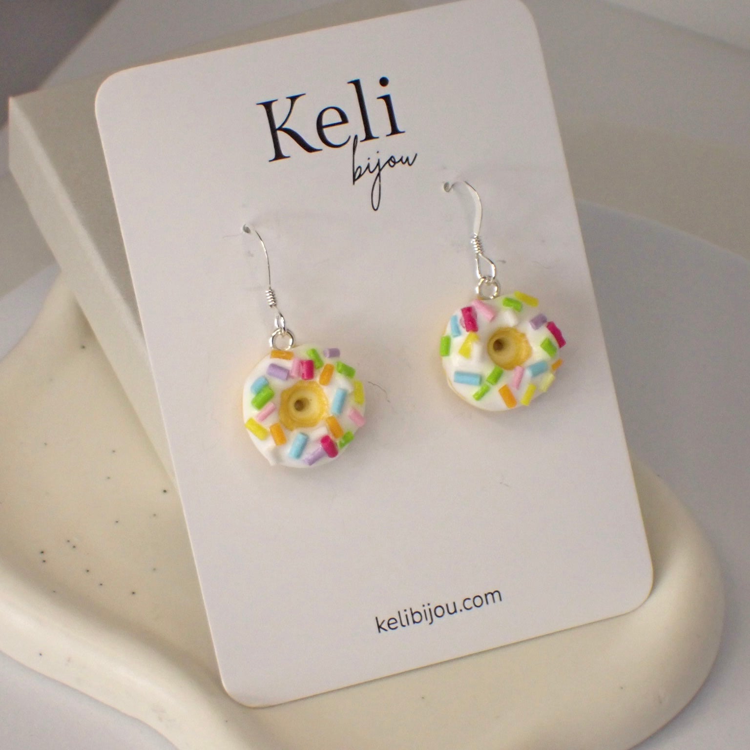 Söta örhängen i polymerlera i form av donuts med glasyr och strössel; fjäderlätta och nickelsäkra, med krokar i äkta silver. Svensk handgjord design från Keli bijou.