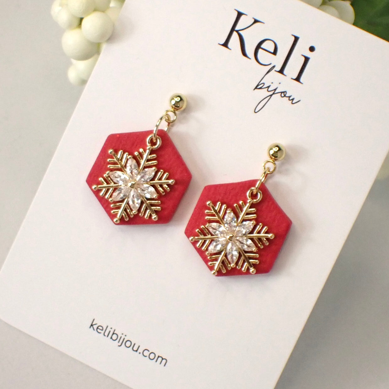 Eira Rouge är örhängen för vinterns mest eleganta stunder. Handgjorda i polymerlera med en kristallbeströdd snöflinga som gnistrar mot det röda. De guldpläterade, nickelsäkra krokarna framhäver den lyxiga känslan och gör örhängena bekväma och fjäderlätta. En exklusiv design från Keli bijou som för tankarna till frost, fest och vinterglamour.