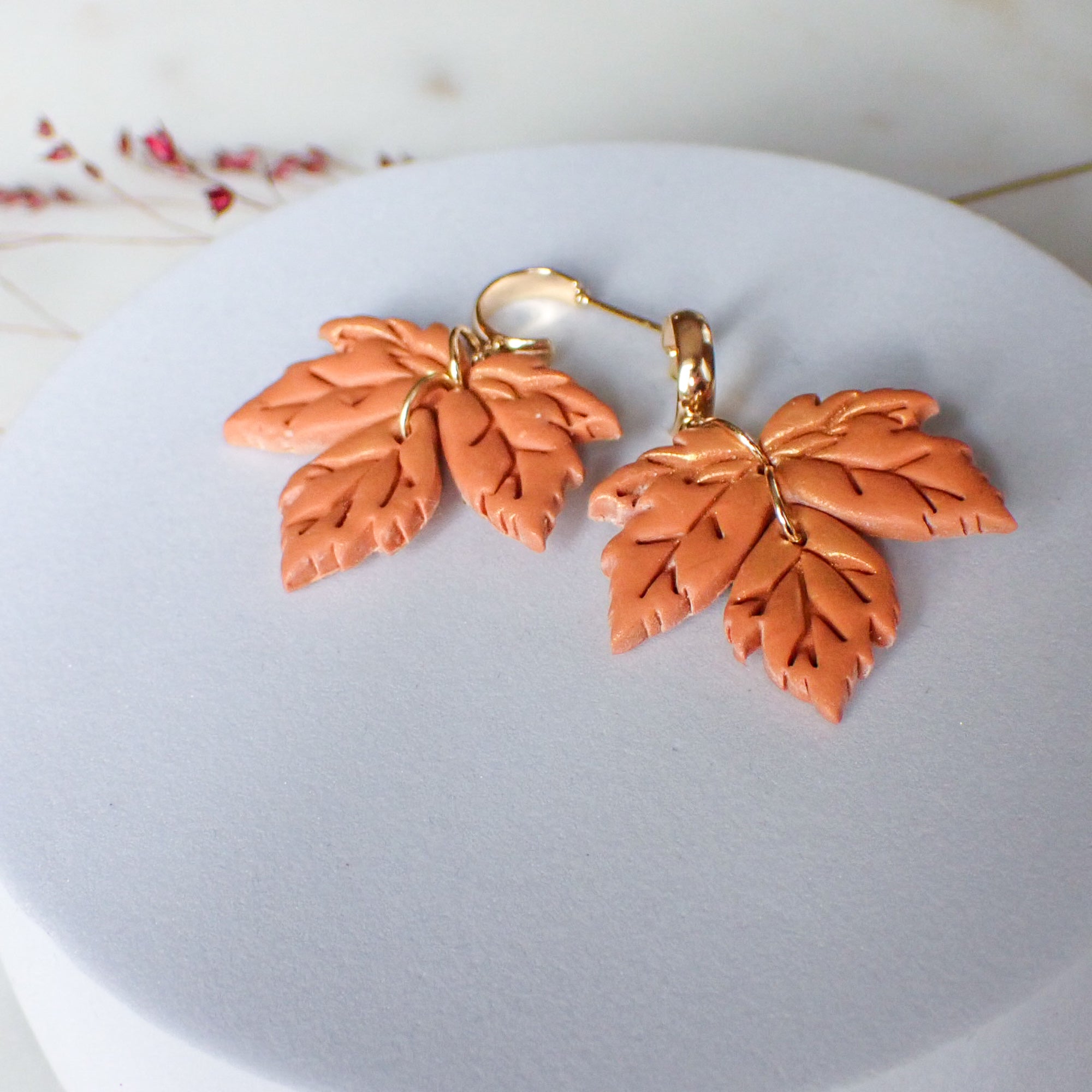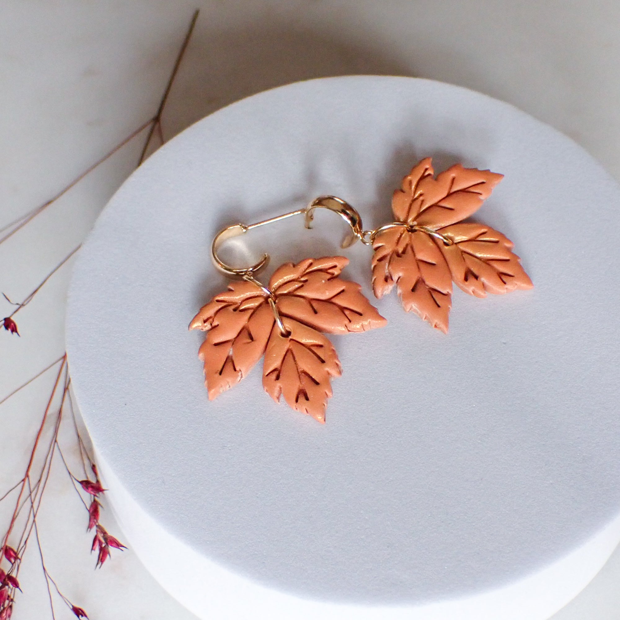 Elina Autumn fångar höstens mjuka skiftningar i dämpade nyanser av koppar och guld. De handgjorda löven i polymerlera har en lätt struktur som fångar ljuset vackert. Varje par är unikt format för hand och fäst på guldpläterade, nickelsäkra detaljer – skonsamma mot huden och bekväma att bära hela dagen.
