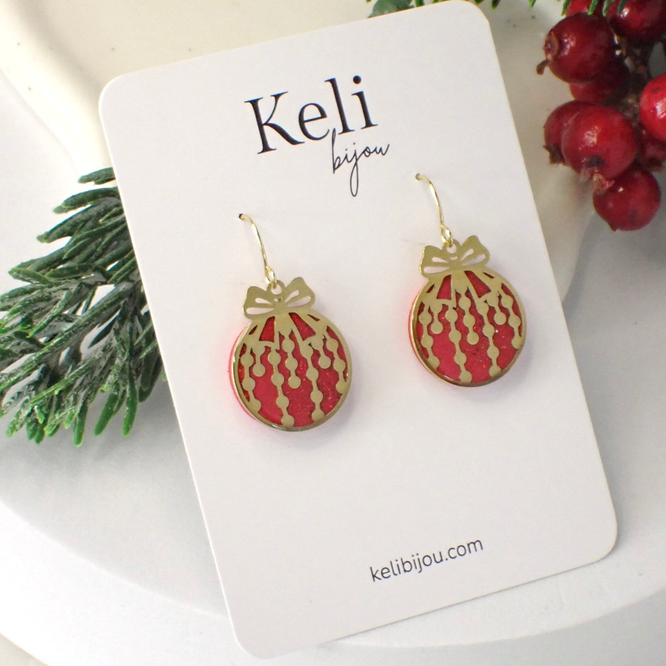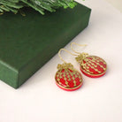 Söta julkulor i rött med klassiska krokar och detaljer i guldpläterat och nickelsäkert stål. Örhängena mäter ca 15 mm i diameter och väger endast något gram - snygga och lätta i örat.