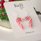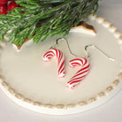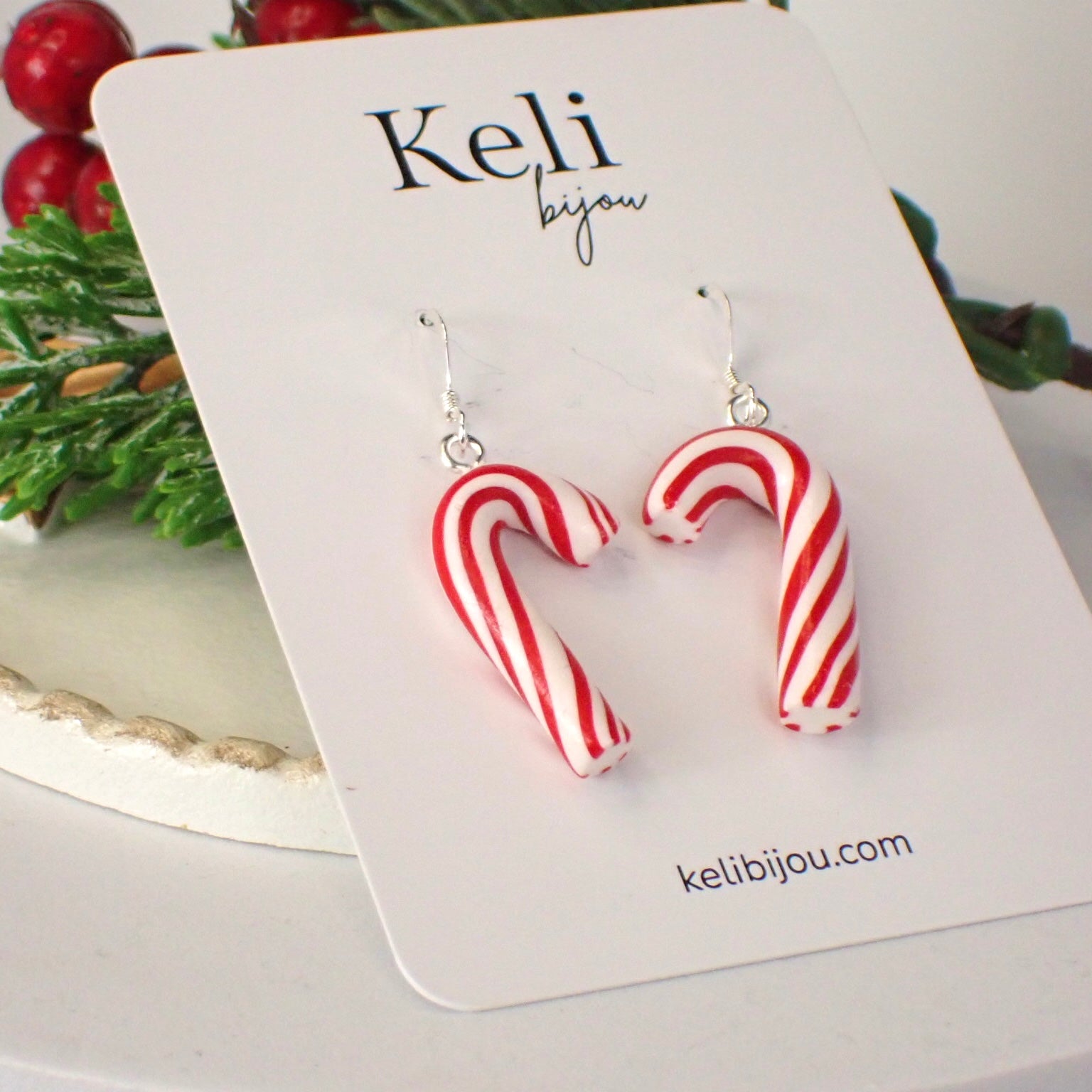 Klassiska polkastänger i miniformat, handgjorda i polymerlera med röd och vit randning. Monterade på nickelsäkra krokar i äkta sterlingsilver.