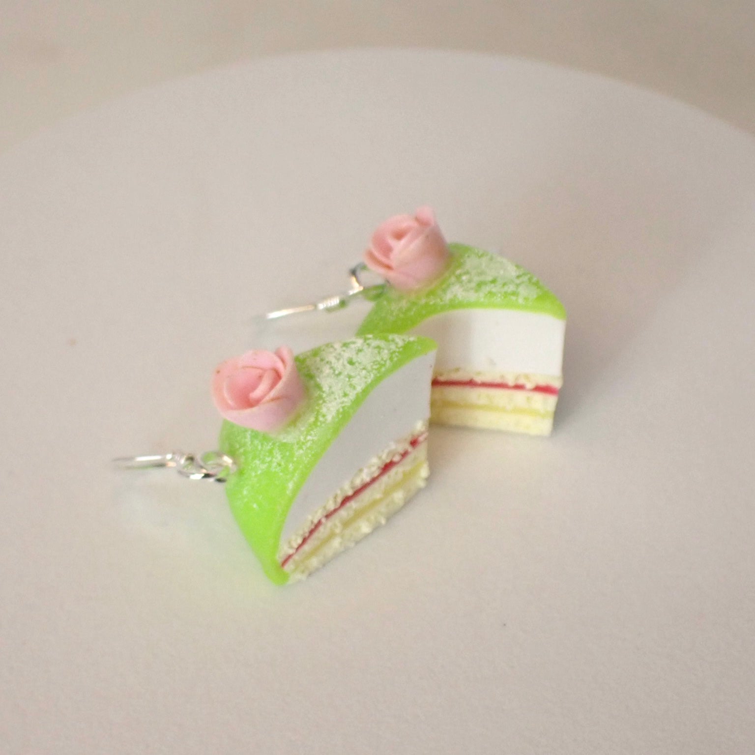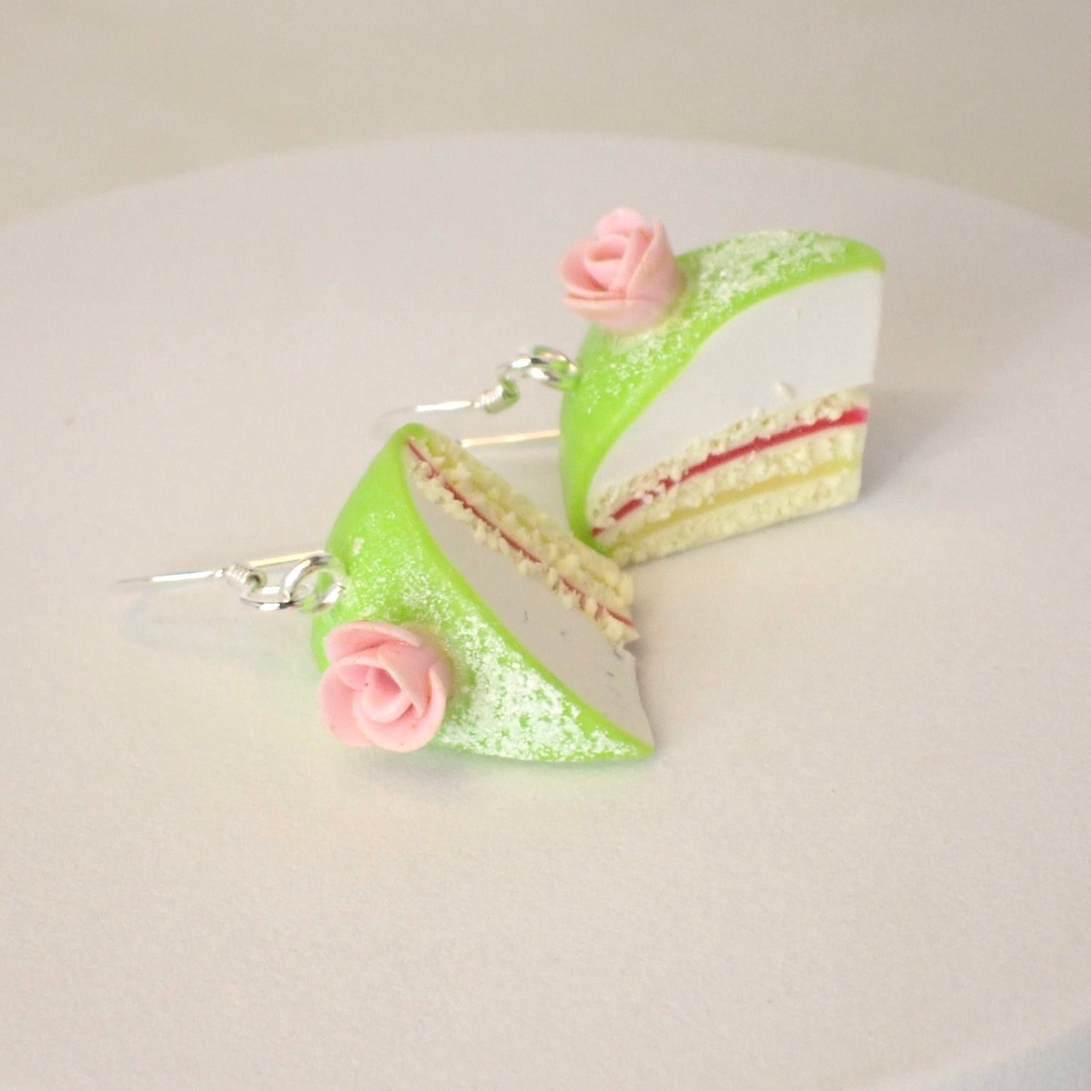 En ikonisk svensk klassiker i smyckesform – dessa handgjorda örhängen i polymerlera återskapar den gröna prinsesstårtans eleganta form, gräddlager och lilla ros på toppen. Varje tårtbit är formad för hand med minutiös precision för att efterlikna verklighetens marsipan och grädde. Den sammetsmatta ytan ger tårtbiten ett mjukt och autentiskt uttryck. Örhängena väger cirka 1,5 gram och mäter runt 20 mm, vilket gör dem fjäderlätta men detaljrika. Tillverkade i nickelsäkra material med krokar i äkta sterlingsilver 925. Ett smycke som kombinerar humor, nostalgi och svensk design – lika charmigt som originalet på fikabordet.