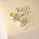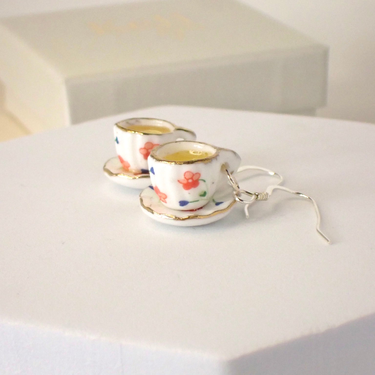 Dessa handgjorda örhängen föreställer små tekoppar på fat, dekorerade med ett blommönster som påminner om barndomens tekoppar. Varje kopp och fat är unika och varje par örhängen blir one of a kind. Örhängena väger omkring 2 gram och mäter cirka 15 mm – lätta i örat men fyllda med detaljrikedom. Tillverkade i nickelsäkra material med krokar i äkta sterlingsilver 925. Ett smycke som förenar elegans, lekfullhet och kärlek till svensk fikakultur.